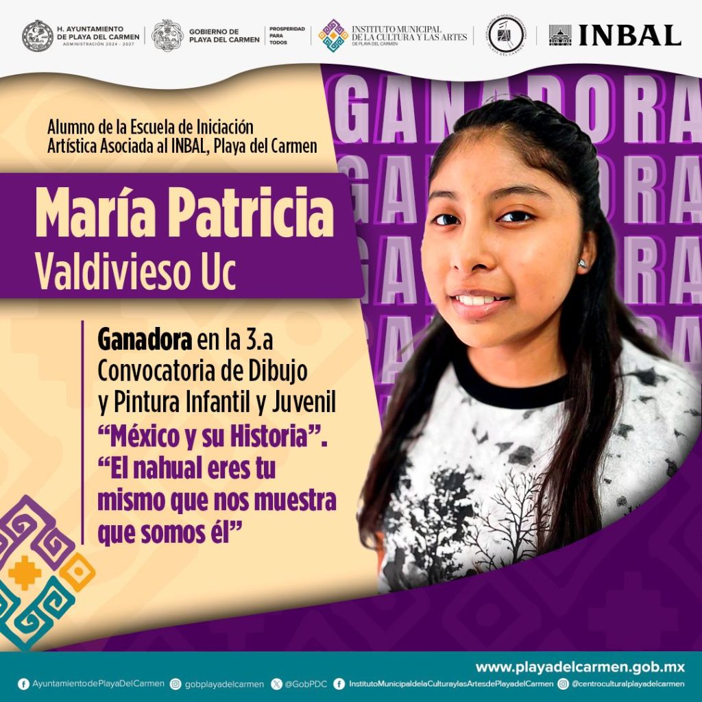 Playa del Carmen, Quintana Roo, 26 de julio de 2025.- La Escuela de Iniciación Artística asociada al Instituto Nacional de Bellas Artes y Literatura (INBAL), informó que su alumna María Patricia Valdivieso Uc de 14 años y su pintura “El nahual eres tú mismo”, ganó la Tercera Convocatoria de Dibujo y Pintura Infantil y Juvenil “México y su historia”, cuya temática fue “Las Leyendas de México”.