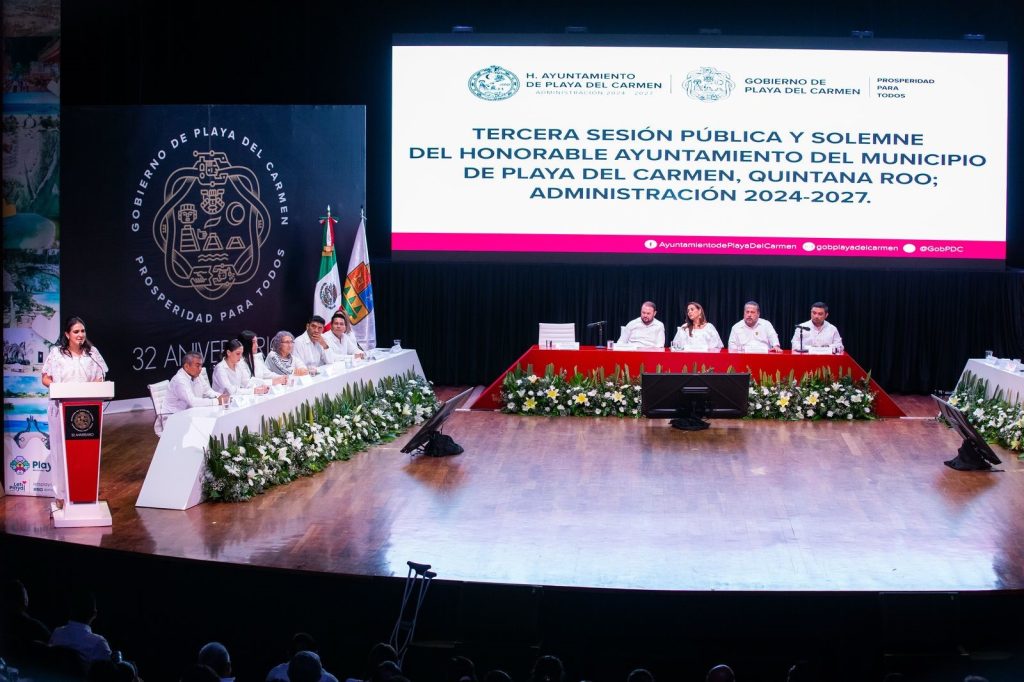 Playa del Carmen, Quintana Roo, 28 de julio de 2025. — “Playa del Carmen no es un lugar donde se nace, es un lugar que se elige con el corazón”, expresó la presidenta municipal Estefanía Mercado durante la Tercera Sesión Pública y Solemne por el 32 aniversario del municipio, ante la presencia de la gobernadora Mara Lezama.