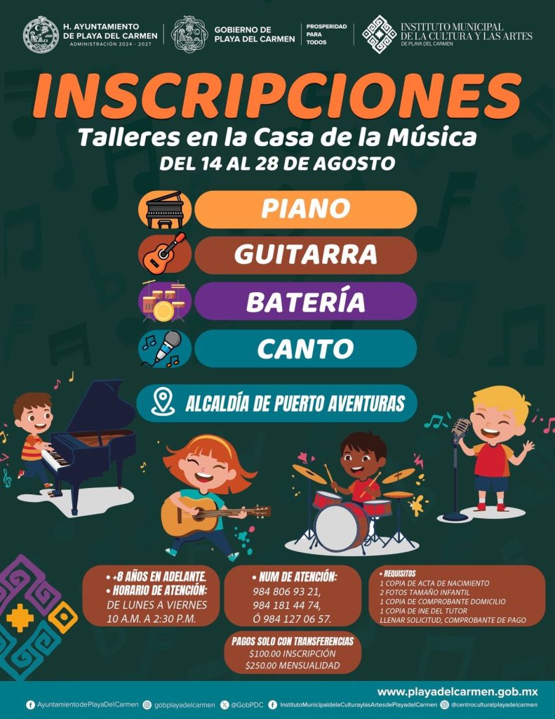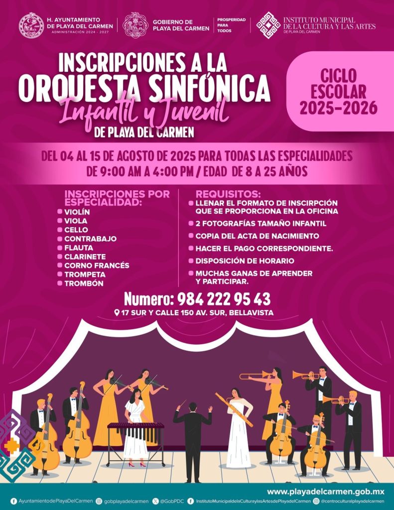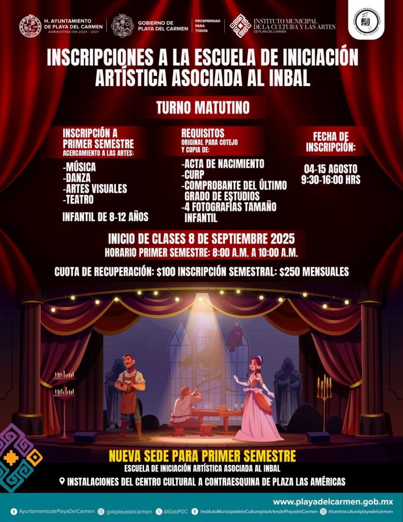 Playa del Carmen, Quintana Roo, 7 de agosto de 2025.- El Instituto Municipal de la Cultura y las Artes de Playa del Carmen informó la apertura del periodo de inscripciones para 48 talleres en la Escuela de Iniciación Artística asociada al INBAL y lugares para la Orquesta Sinfónica Infantil y Juvenil.