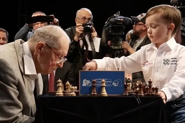Entre las estrellas también ha habido casos notables. La televisión rusa organizó en 2017 un encuentro entre Yuri Averbaj, gran maestro que entonces tenía 95, contra el pequeño Misha Osipov, de cuatro. El pequeño era famoso desde los tres, cuando rompió a llorar en otro plató tras perder contra Anatoli Karpov. Por lo visto, esperaba derrotarlo. Por si alguien se lo pregunta, ahora tiene 12 y no parece ningún portento.