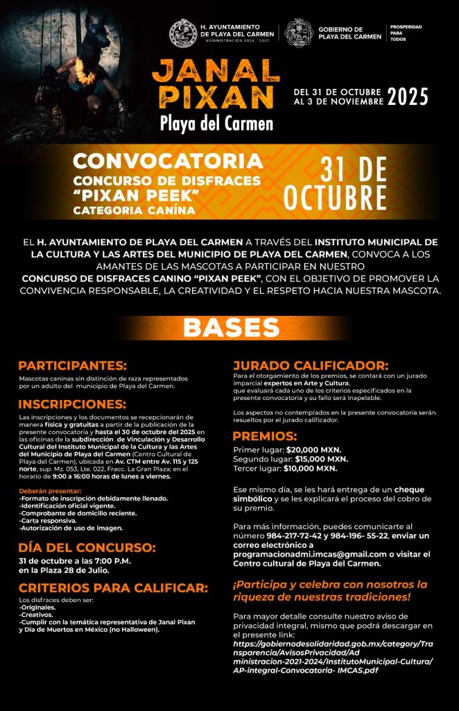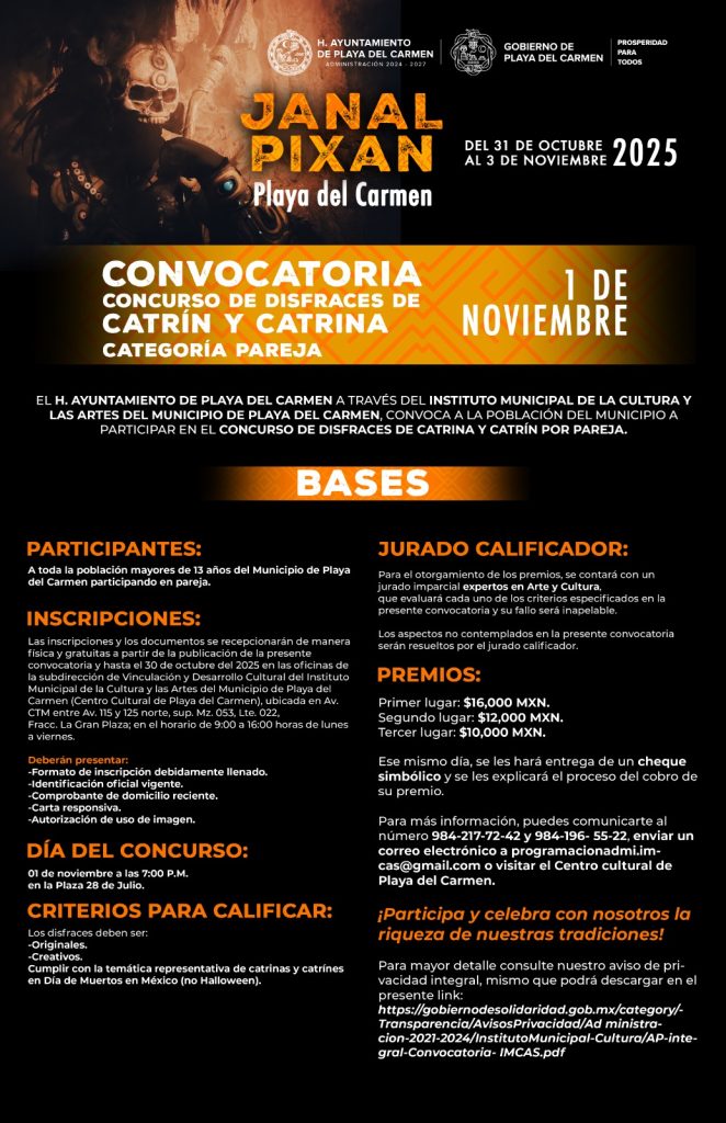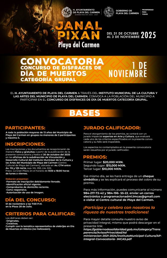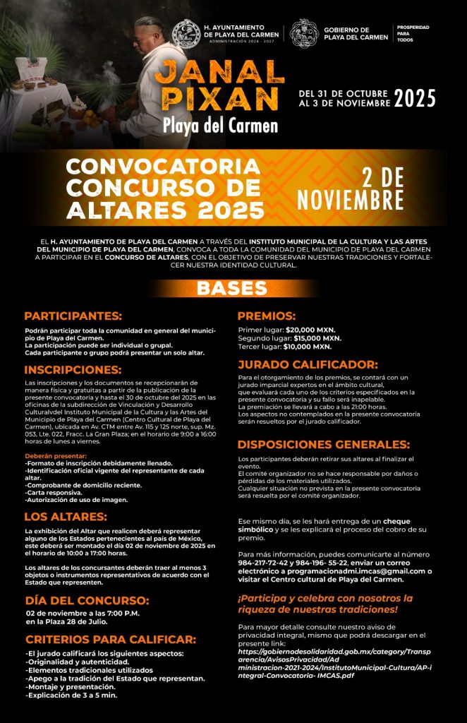 Playa del Carmen, Quintana Roo, 22 de octubre de 2025.- El Instituto Municipal de la Cultura y las Artes de Playa del Carmen invitó a las familias playenses a participar en los diversos concursos que se llevarán a cabo en el marco de las festividades del Janal Pixan 2025, con una bolsa en premios de casi 200 mil pesos.