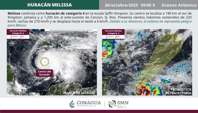 De acuerdo con el último reporte del SMN, emitido a las 09:00 horas de este domingo 26 de octubre, el centro del huracán Melissa se encuentra a mil 200 kilómetros al este-sureste de Cancún, lejos Península de Yucatán.