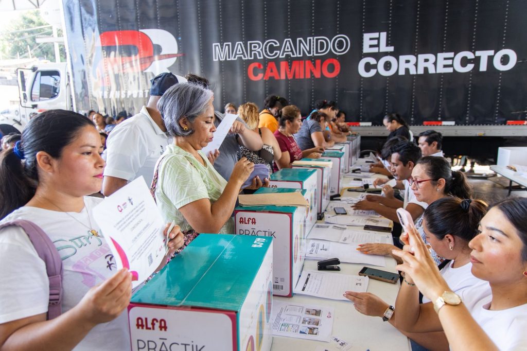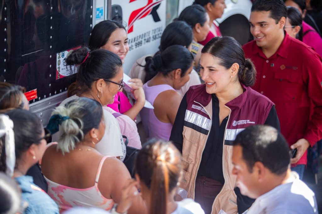 Playa del Carmen, Quintana Roo, 3 de diciembre de 2025.— La presidenta municipal Estefanía Mercado visitó este miércoles el módulo instalado por la Secretaría del Bienestar (Sebien) para supervisar la entrega de máquinas de coser de la Fábrica de Artes y Oficios (Faro), paquetes alimentarios del programa “Comemos Todos” y afiliación al programa “Salud Sin Tanto Choro”, una iniciativaque acerca atención médica directa, rápida y sin trámites complicados a las familias playenses.