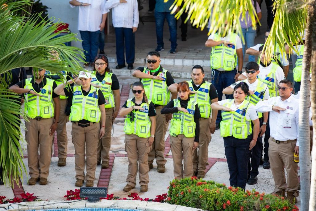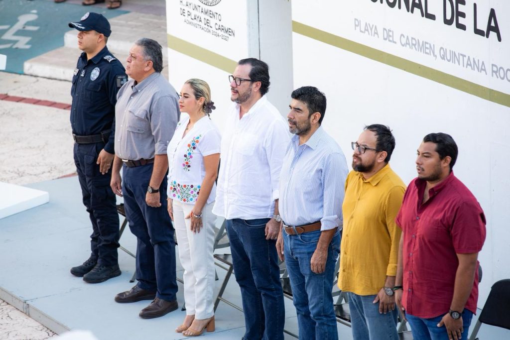 Durante la ceremonia cívica, que se llevó a cabo en el patio central del antiguo Palacio Municipal, se contó con la presencia del cuarto regidor Uri Carmona Islas; el secretario de Salud, José Antonio Uribe Trujillo; Jesús Rodríguez Herrera, director general del Sistema DIF Playa del Carmen; el comandante Diego Amílcar Morelos Ramírez, director de Proximidad Social; el secretario de Protección Civil, Prevención de Riesgos y Bomberos, Darwin Covarrubias, y representantes de distintas áreas del gobierno municipal.