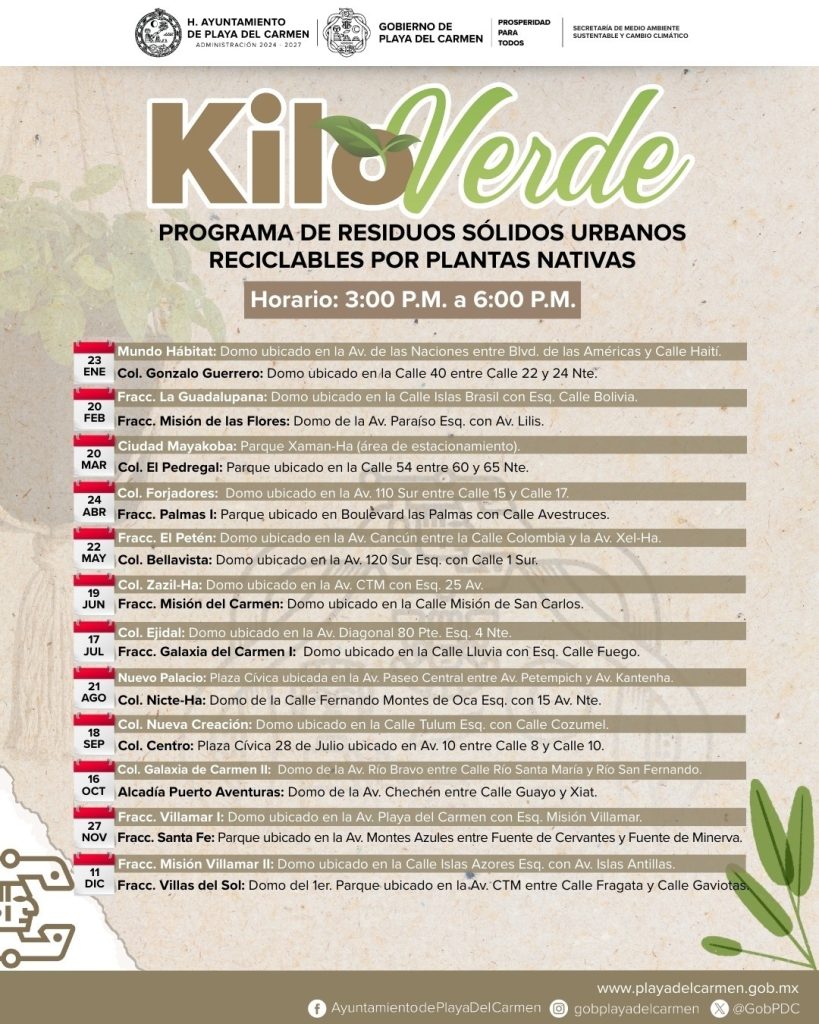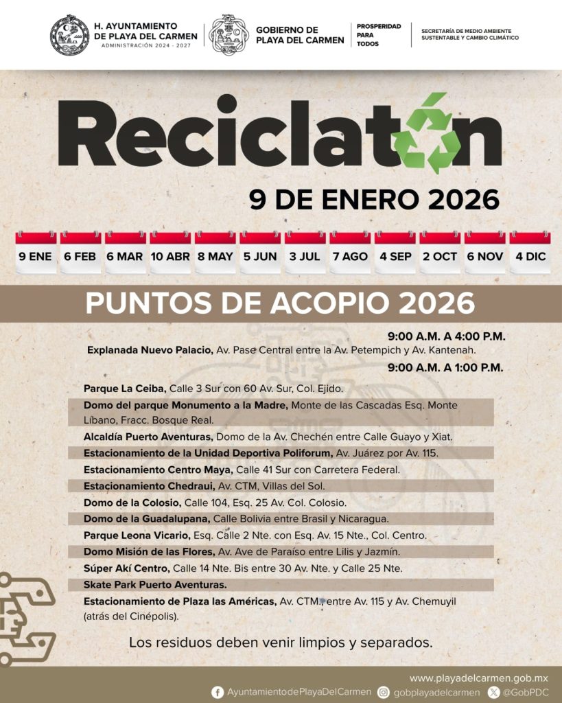 La primera edición del Reciclatón 2026 se llevará a cabo el 9 de enero, en los 14 Puntos de Acopio Temporales; mientras que el programa Kilo Verde, que es una campaña que fomenta una cultura ecológica con atención particular al cuidado de la flora nativa, iniciará actividades el 23 de enero, en los domos del fraccionamiento Mundo Hábitat y de la colonia Gonzalo Guerrero, en esta ciudad.