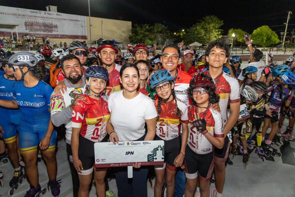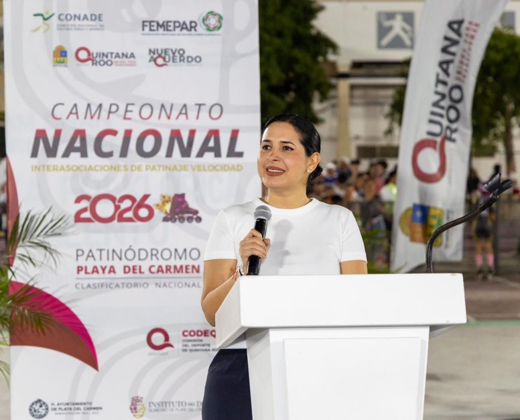 Playa del Carmen, Quintana Roo, 27 de marzo de 2026.— La presidenta municipal Estefanía Mercado inauguró el Campeonato Nacional Interasociaciones de Patinaje de Velocidad 2026, en el Poliforum Playa del Carmen, donde destacó el impulso de su gobierno al deporte como motor de desarrollo, bienestar y construcción de comunidad. Playa del Carmen reafirma su liderazgo como sede de grandes eventos deportivos.