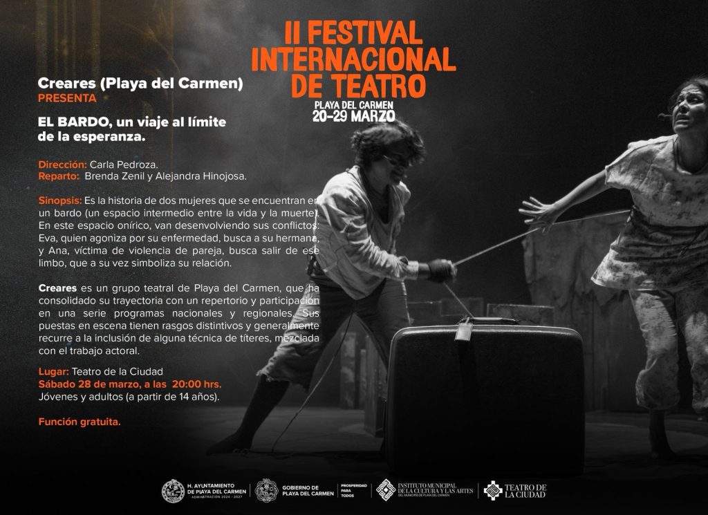 Playa del Carmen, Quintana Roo, 28 de marzo de 2026.- El Festival Internacional de Teatro en su segunda edición, tendrá su broche de oro con la presentación de “El Bardo”, en punto de las 8 de la noche en el Teatro de la Ciudad, este sábado 28 de marzo.