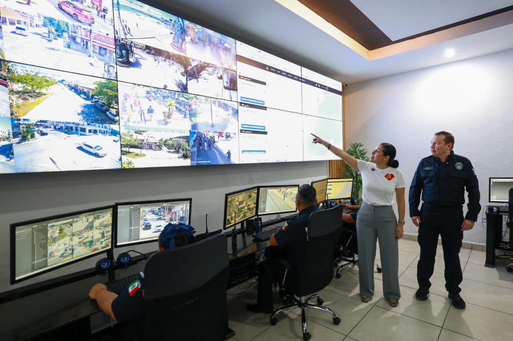 Playa del Carmen, Quintana Roo, 9 de abril de 2026.— La presidenta municipal Estefanía Mercado, acompañada por el secretario de Seguridad Ciudadana Municipal (SSCM), Carlos Montesinos, realizó una visita al Centro de Control, Comando, Comunicación y Cómputo (C4), donde supervisó el funcionamiento del innovador sistema de vigilancia policial a través de cámaras corporales (bodycams).